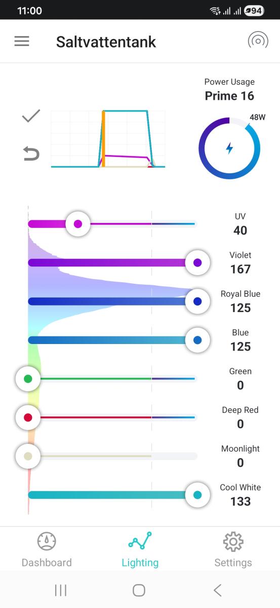 Jag kan max köra ca 48w på min AI lampa, fläkten går för fullt såklart.. Men antar som sagt att jag kräver en bättre lampa för att få korallerna att trivas