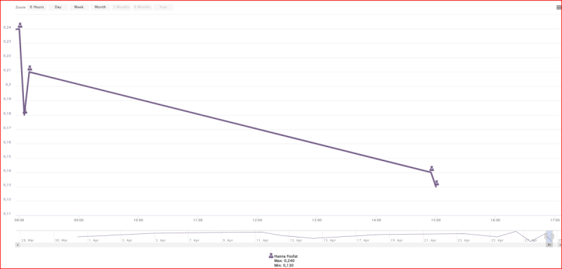 Mitt experiment startade kl 18:00 den 22/4 och jag doserar kontinuerligt in en lösning i takten 0,1 ml/minut som på dygnsbasis motsvarar en tillsättning av 1 ml vodka per dag. Igår var det tredje dagen på experimentet och min filtervadd visade upp ganska mycket bakterie biomassa Vid ett tidigare tillfälle så visar bilden under hur min filtervadd såg ut efter 9 dagar utan någon extra vodka Så här såg det ut efter ca 2.5 dagar med en kontinuerlig tillsats av 1 ml vodka per dag direkt in i filtret Så här såg reaktorn ut innan/efter jag bytte filtervadd PO4 koncentrationer för sista månaden uttryckt i ppm. 1 röd stapel - bytt GFO + filtervadd. 2 och 3 röda staplar bytt filtervadd 4 röda staplar tillagt 100 g GFO + bytt filtervadd och 5 röda staplar börjat dosera 1 ml vodka per dag och bytt filtervadd. Igår byte av filtervad - syns inte i grafen. Minskningen efter start av dosering av PO4 i grafen kan vara tillfällig - avvaktar flera mätningar innan jag drar några slutsatser. MVH Lasse