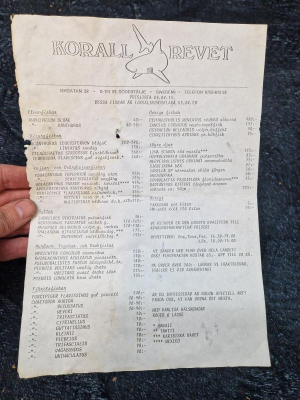 Måste bara dela det här. Hitta den på vinden för några år sedan 😀. LEUCOSTERNON blågul. 220-400 kr LINEATUS randig 150 kr Fantastiskt 🐟 Flygfrakten kostar 65 kr. Haha !!! 1983 var ett bra år 🤪💥