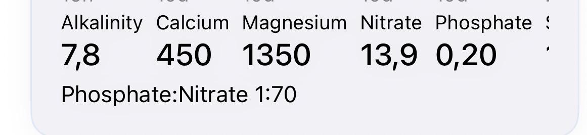 25. kan vara, men behöver inte vara problemet. du har inte extremt lågt i vilket fall. dock är din fosfat extremt hög :) ska du inte försöka jobba ner den? jag tror koraller inte måra i så höga nivåer och jag tror att där kan du ha din källa till att korallerna mår dåligt.