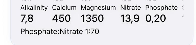 2. Hemma test på bilden jämfört med aqua forest. Kh 8.4 No3 22 Mg 1371 Ca 443 P04 0.49 Har aldrig haft så stor skillnad på näringsvärde innan men i övrigt är det ganska nära. Jag mäter mg och ca med salifert resten med Hannah